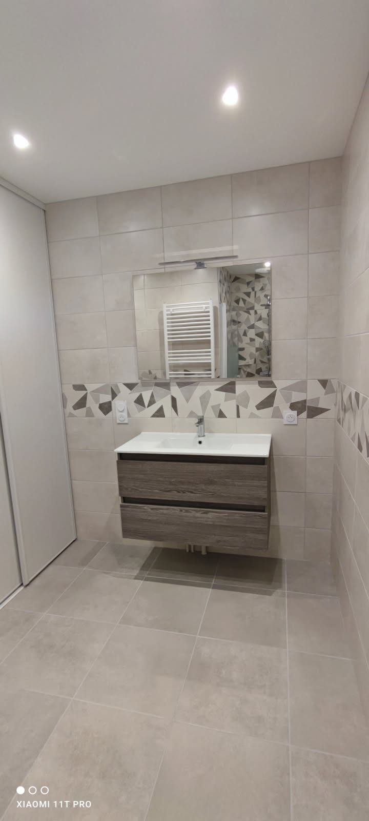 Le changement le plus radical de ce projet a été la suppression de l’ancienne tapisserie. Outre l’aspect esthétique, le passage au carrelage offre une hygiène irréprochable et une durabilité maximale face à l’humidité.
